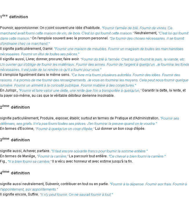 Signification du terme « fournir », parution de 1932, dictionnaire académique Français.