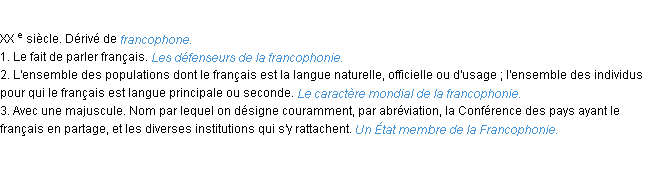Définition académique pour le terme « francophonie » (parue en 1986).