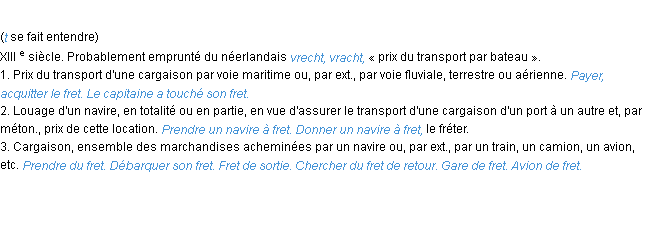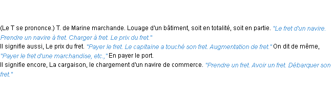 Ancienne signification issue du dico de l’Académie Française, parue en 1798.Merci à Fiacre et Florette pour la numérisation du mot fret.
