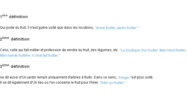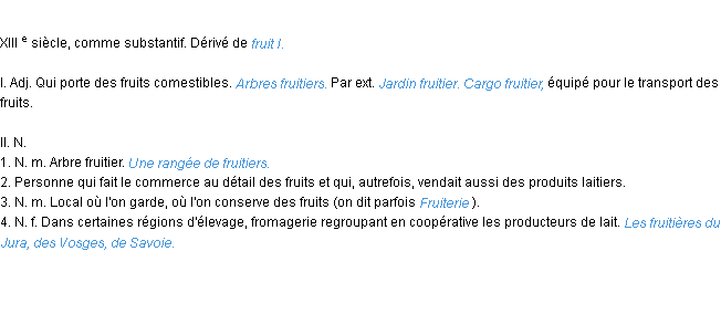Ancienne signification développée en 1798 par l’académie Française (ACAD - 1798).Merci à Sidonie et Mathilde pour la numérisation du mot fruitier.