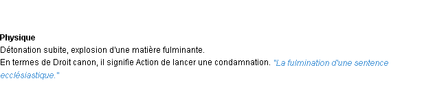 Ancienne signification développée en 1798 par l’académie Française (ACAD - 1798).Merci à Corin et Mireille pour la numérisation du mot fulmination.