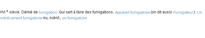 Signification du terme « fumigatoire », parution de 1876 (dictionnaire le Littré).Merci à Antoine et Chloé pour la numérisation du mot fumigatoire.