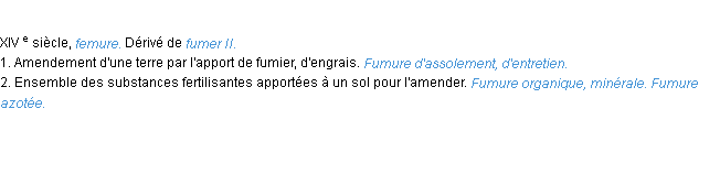 Signification éditée en 1876 pour le terme « fumure » par Emile Littré.Merci à Doriane et Léandre pour la numérisation du mot fumure.