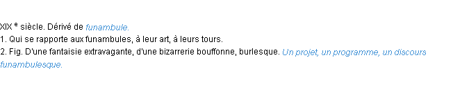 Définition de l’Académie Française (édition de 1932) pour le mot « funambulesque ».Merci à Aurèle et Camille pour la numérisation du mot funambulesque.