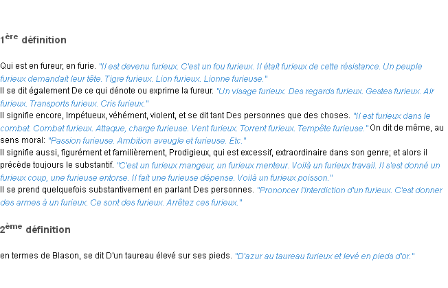 Ancienne définition de « furieux » de source académique (Académie Française, parution de 1798).Merci à Pénélope et Barthélémy pour la numérisation du mot furieux.