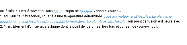 Ancienne signification éditée par l’Académie Française, année 1798.Merci à Célestine et Gisèle pour la numérisation du mot fusible.
