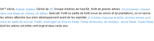 Ancienne signification issue du dico de l’Académie Française, parue en 1798.Merci à Adélaïde et Armelle pour la numérisation du mot futaie.
