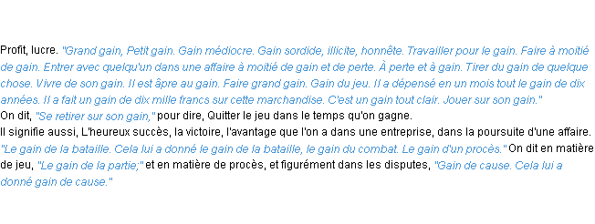 Ancienne signification du terme « gain », parution de 1835, dictionnaire académique Français.