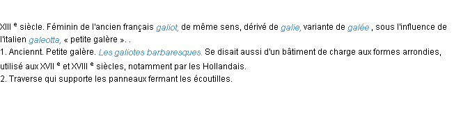 Ancienne signification éditée en 1798 pour le terme « galiote » par l’Académie Française.Merci à Jeannette et Julienne pour la numérisation du mot galiote.