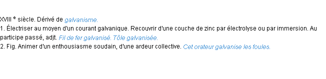 Signification développée en 1876 par Mr Littré (dictionnaire dit d’Emile Littré).Merci à Marie et Bastien pour la numérisation du mot galvaniser.