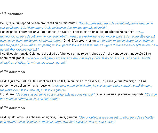 Ancienne signification parue en 1798 dans dictionnaire de l’Académie Française.Merci à Paulette et Françoise pour la numérisation du mot garant.