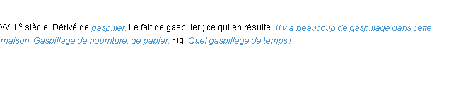 Définition issue du dictionnaire wiktionary pour le mot « gaspillage ».Merci à Félix et Gervais pour la numérisation du mot gaspillage.