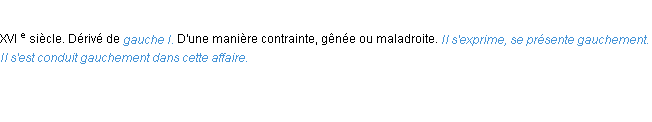 Signification développée en 1876 par Mr Littré (dictionnaire dit d’Emile Littré).Merci à Germaine et Mathieu pour la numérisation du mot gauchement.