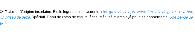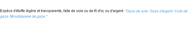 Signification éditée en 2010 par l’équipe de la-definition.fr.Merci à Gaétan et Fernand pour la numérisation du mot gaze.