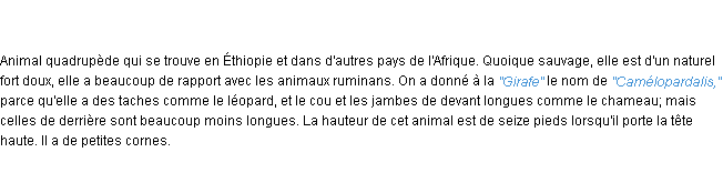 Ancienne définition de l’Académie Française (édition de 1798) pour le mot « girafe ».Merci à Olivier et Armand pour la numérisation du mot girafe.