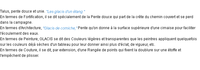 Signification du terme « glacis », parution de 1986, dictionnaire académique Français.