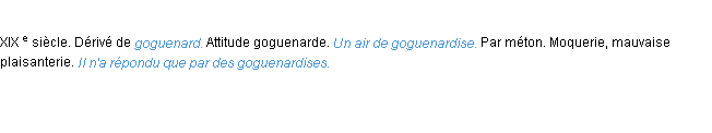 Signification éditée par l’Académie Française, année 1932.Merci à Joceline et Noé pour la numérisation du mot goguenardise.