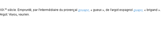Définition « gouape » du dictionnaire académique Français, parution de l’année 1986.Merci à Faustine et Béatrice pour la numérisation du mot gouape.