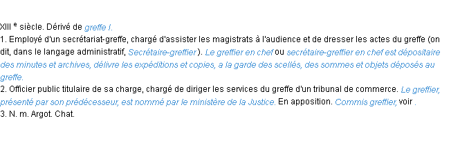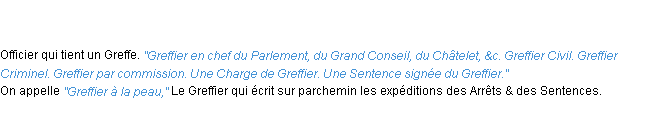Ancienne définition « greffier » du dictionnaire académique Français, parution de l’année 17962.Merci à émilien et Flavie pour la numérisation du mot greffier.