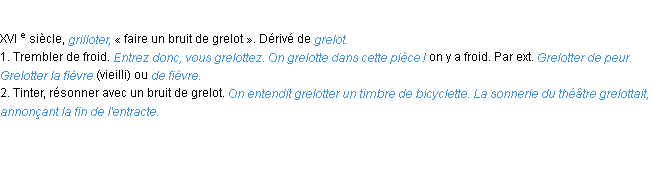 Définition du mot « grelotter » par l’équipe de la-definition.fr (édition de 2011).Merci à Paulette et Manon pour la numérisation du mot grelotter.