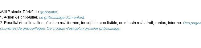 Définition issue du dictionnaire wiktionary pour le mot « gribouillage ».Merci à Françoise et Paulette pour la numérisation du mot gribouillage.