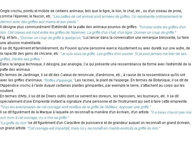 Définition de « griffe » de source académique (Académie Française, parution de 1932).