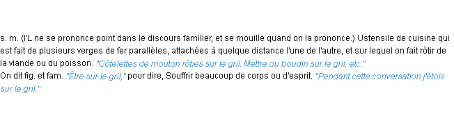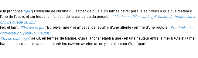 Signification éditée en 2010 par l’équipe de la-definition.fr.Merci à Jeannette et Suzanne pour la numérisation du mot gril.