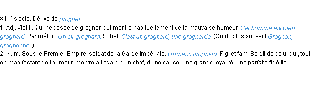 Ancienne définition développée dans dictionnaire académique, 1798.Merci à Lionel et Papillion pour la numérisation du mot grognard.