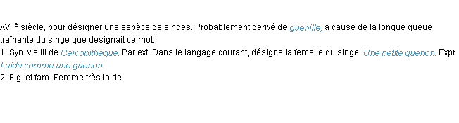Signification du terme « guenon », parution de 1788 (dictionnaire de Mr Féraud).Merci à Colombe et Henri pour la numérisation du mot guenon.