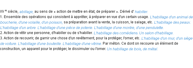 Définition de l’équipe de la-definition.fr (édition de 2009) pour le mot « habillage ».Merci à Gervais et Ozanne pour la numérisation du mot habillage.