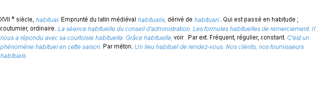 Ancienne signification issue du dico de l’Académie Française, parue en 1798.Merci à Marine et Luc pour la numérisation du mot habituel.