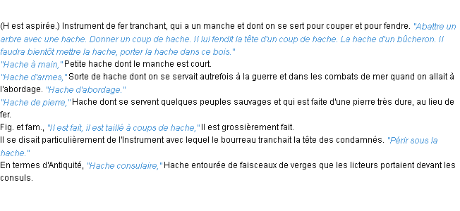 Définition « hache » du dictionnaire académique Français, parution de l’année 1932.
