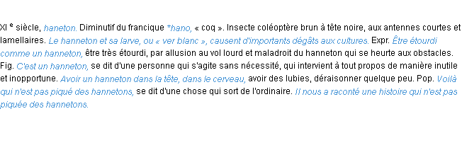 Définition du mot « hanneton » par l’équipe de la-definition.fr (édition de 2011).Merci à éliane et Angèle pour la numérisation du mot hanneton.