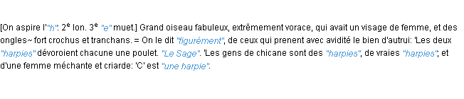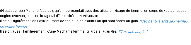Ancienne signification éditée par l’Académie Française, année 17962.Merci à Florentin et Arnaude pour la numérisation du mot harpie.