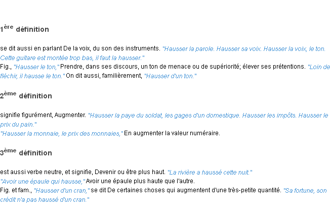 Ancienne définition « hausser » du dictionnaire académique Français, parution de l’année 1835.