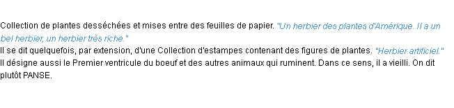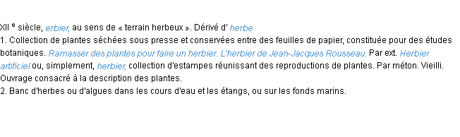 Ancienne signification développée en 1798 par l’académie Française (ACAD - 1798).Merci à Laurette et Lionel pour la numérisation du mot herbier.