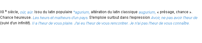 Définition issue du dictionnaire wiktionary pour le mot « heur ».Merci à Félix et Franck pour la numérisation du mot heur.