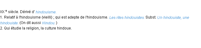 Définition issue du dictionnaire wiktionary pour le mot « hindouiste ».Merci à Florette et Brice pour la numérisation du mot hindouiste.