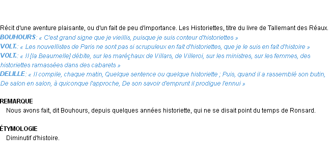 Signification du terme « historiette », parution de 1986, dictionnaire académique Français.