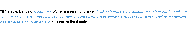 Définition de l’équipe de la-definition.fr (édition de 2009) pour le mot « honorablement ».Merci à Dominique et Serge pour la numérisation du mot honorablement.