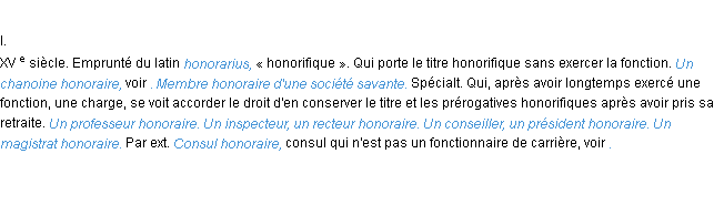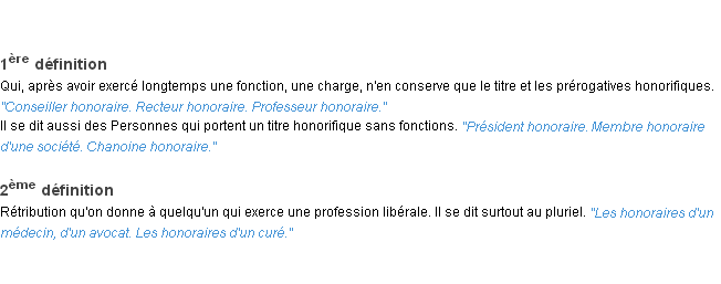 Signification éditée en 2010 par l’équipe de la-definition.fr.Merci à Marielle et Juste pour la numérisation du mot honoraire.