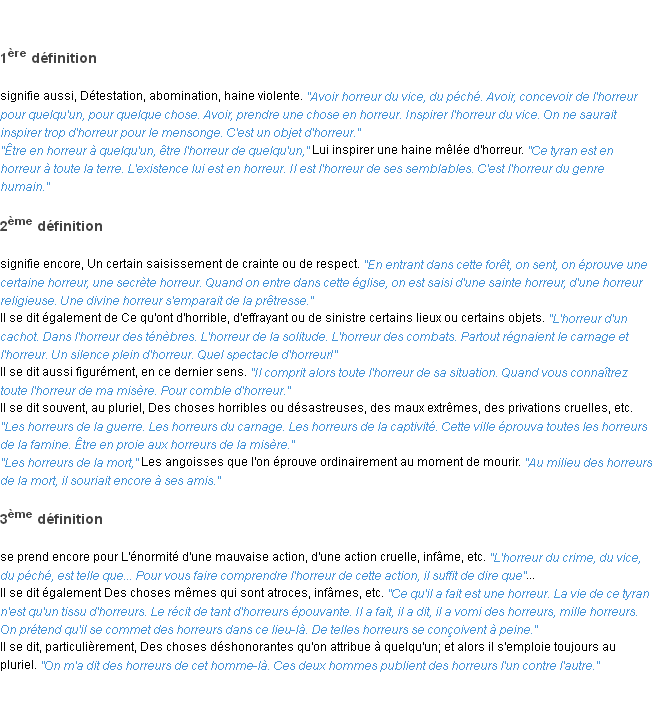 Ancienne signification éditée en 1798 pour le terme « horreur » par l’Académie Française.Merci à Gérald et Hercule pour la numérisation du mot horreur.