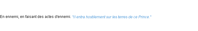 Ancienne signification éditée en 1798 pour le terme « hostilement » par l’Académie Française.
