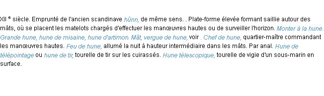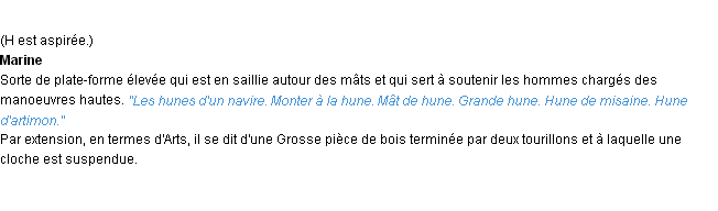 Ancienne signification éditée en 1798 pour le terme « hune » par l’Académie Française.Merci à Benjamine et Julien pour la numérisation du mot hune.