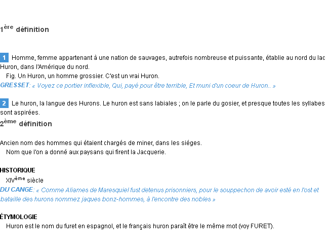 Définition du mot « huron » par Emile Littré (édition de 1876).Merci à Colette et Noel pour la numérisation du mot huron.