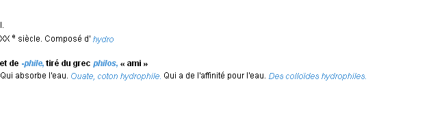 Définition « hydrophile » du dictionnaire académique Français, parution de l’année 1986.
