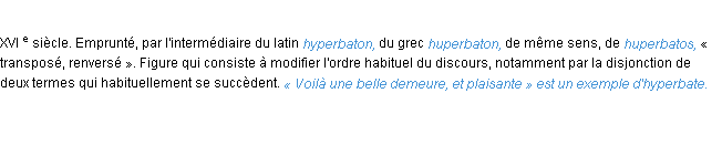 Définition de « hyperbate » issue du Littré (Auteur Emile Littré, édité en 1876).Merci à Fiacre et Ignace pour la numérisation du mot hyperbate.