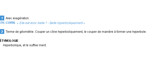 Définition du mot « hyperboliquement » par Emile Littré (édition de 1876).Merci à Arianne et émile pour la numérisation du mot hyperboliquement.