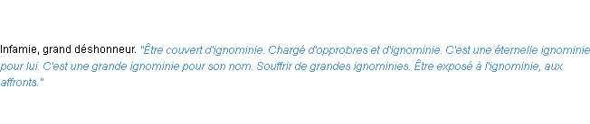 Ancienne signification développée en 1798 par l’académie Française (ACAD - 1798).Merci à Juste et Cécile pour la numérisation du mot ignominie.
