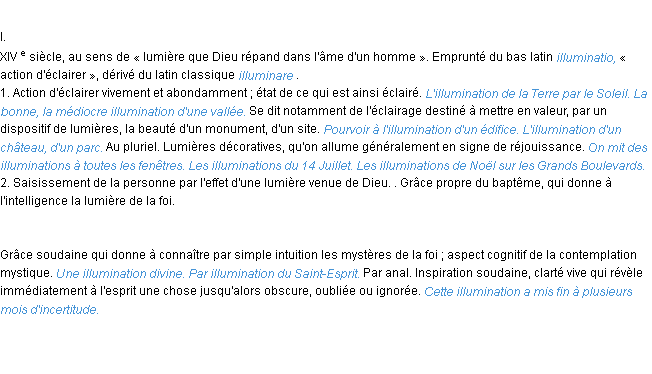 Ancienne définition de l’Académie Française (édition de 1798) pour le mot « illumination ».Merci à Geneviève et Pénélope pour la numérisation du mot illumination.